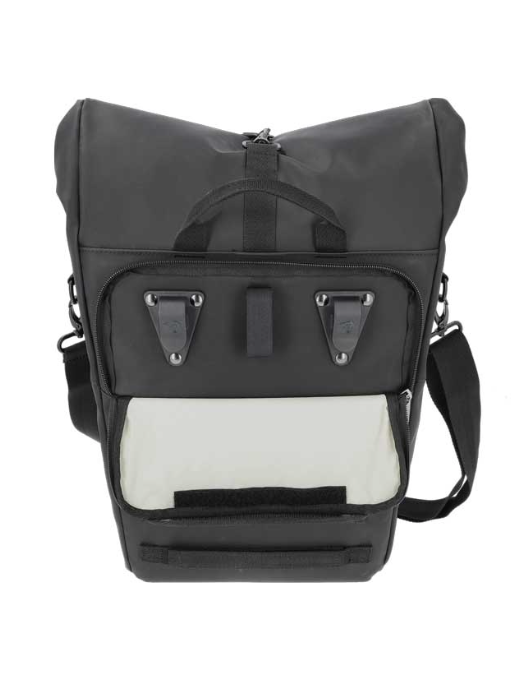 Fietstas Nyborg van New Looxs heeft een stoer uiterlijk en is waterafstotend. De zwarte tas heeft een rolsluiting, een laptopvak en een afneembare schouderband.